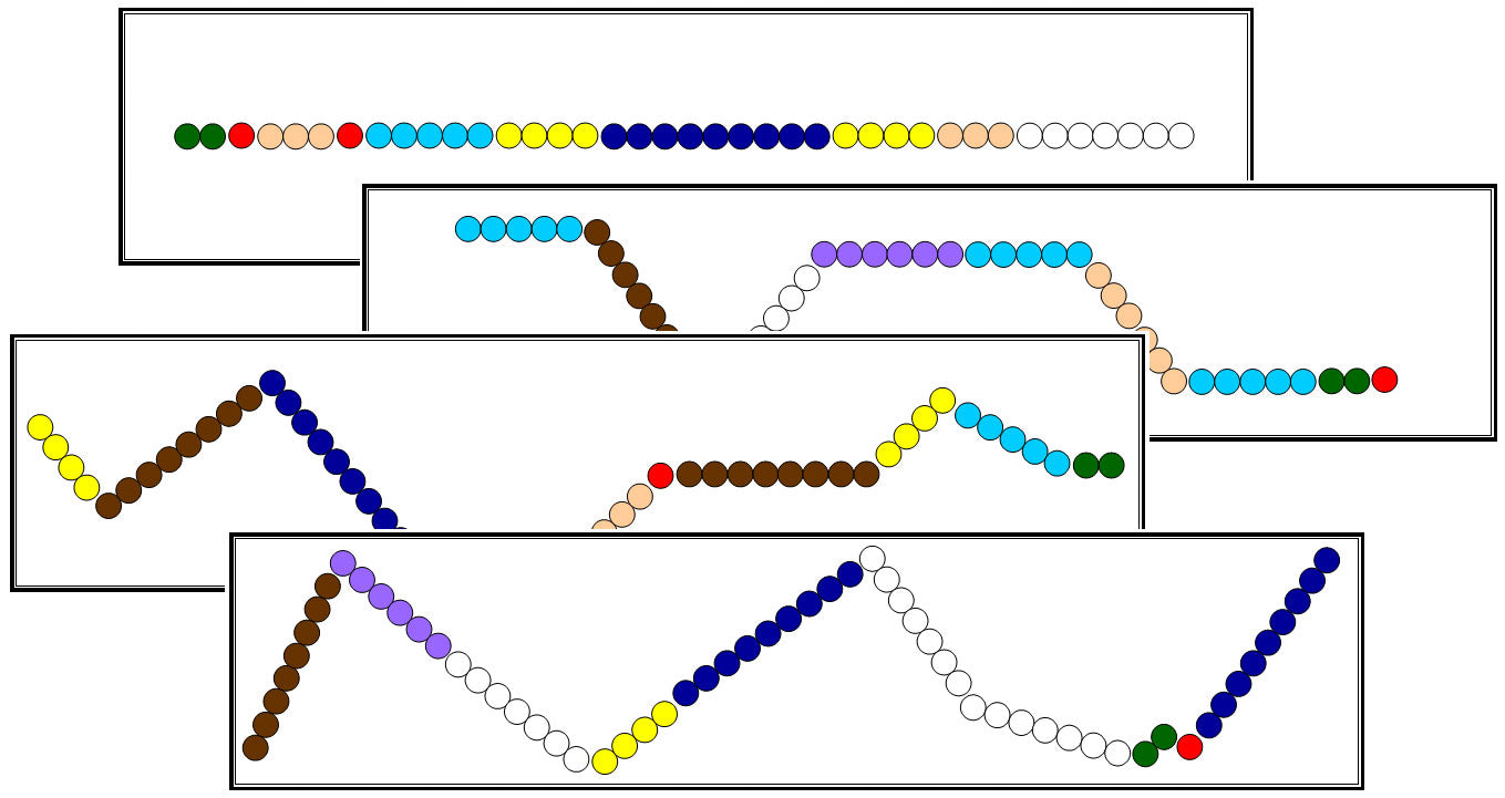 The children copy the snakes using the color bead bars, then complete the addition process using the golden ten bars and colored beads.