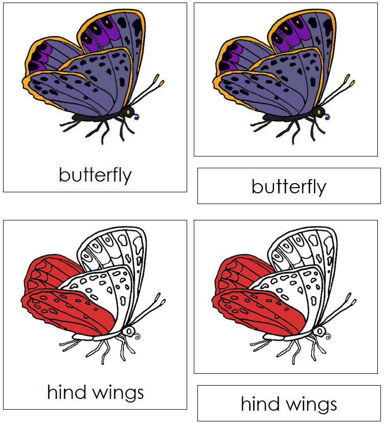 The Butterfly Nomenclature Cards are formatted in 3-part cards and include a blackline master. The 11 parts of the butterfly: butterfly, antennae, eye, proboscis, legs, body, head, thorax, abdomen, hind wings, and forewings.