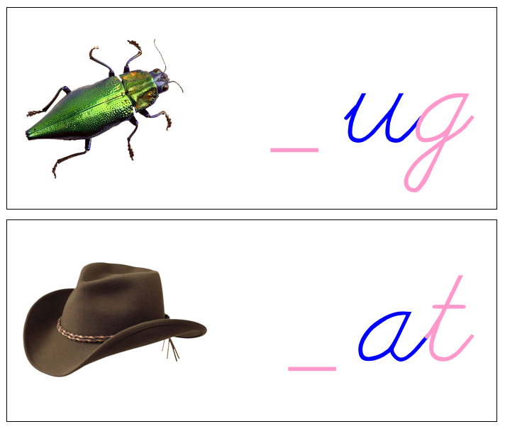Each card has a 3-letter phonetic word and picture. Fill in the missing initial sounds using the wooden Moveable Alphabet letters. Place the missing letter directly on top of the card.