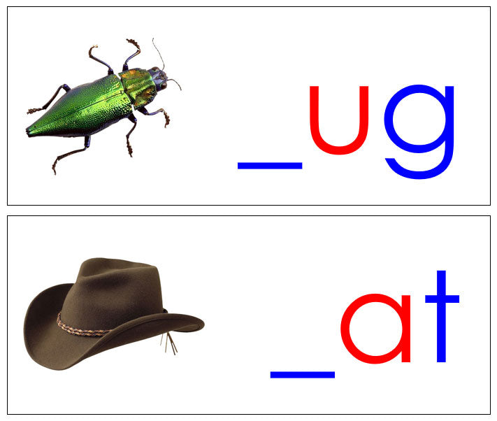 Each card has a 3-letter phonetic word and picture. Fill in the missing initial sounds using the wooden Moveable Alphabet letters. Place the missing letter directly on top of the card.
