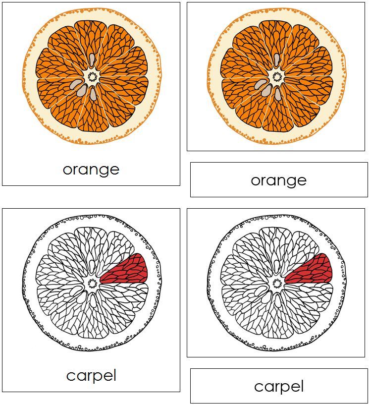 The Orange Nomenclature Cards are formatted in 3-part cards and include a blackline master. The 8 parts of the orange: orange, exocarp, mesocarp, endocarp, carpel, juice follicle, seeds, and rind.