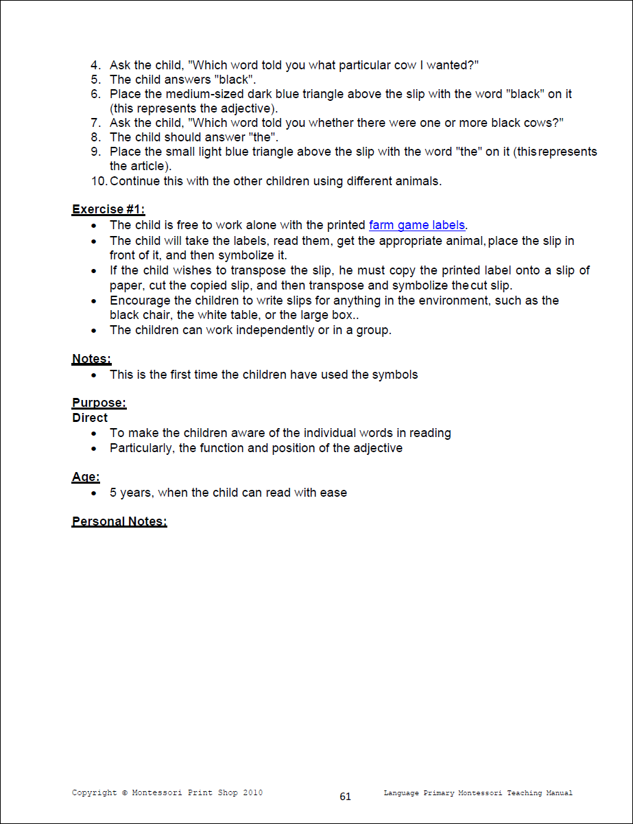 A complete and comprehensive teaching manual for the Primary level Language (ages 2½ to 6 years of age). Based on AMI principles and concepts.