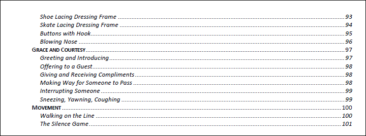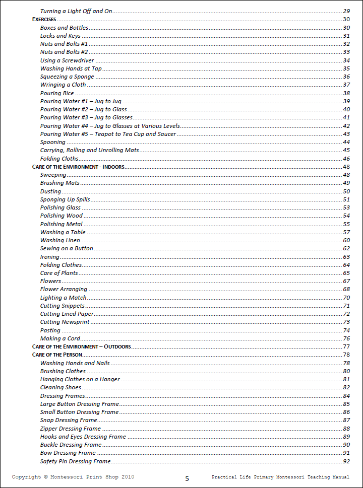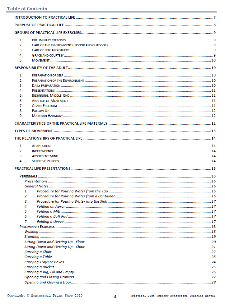 A complete and comprehensive teaching manual for the primary level practical life (ages 2½ to 6 years of age). Based on AMI principles and concepts.
